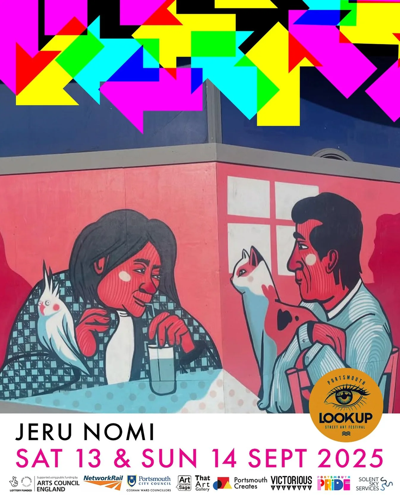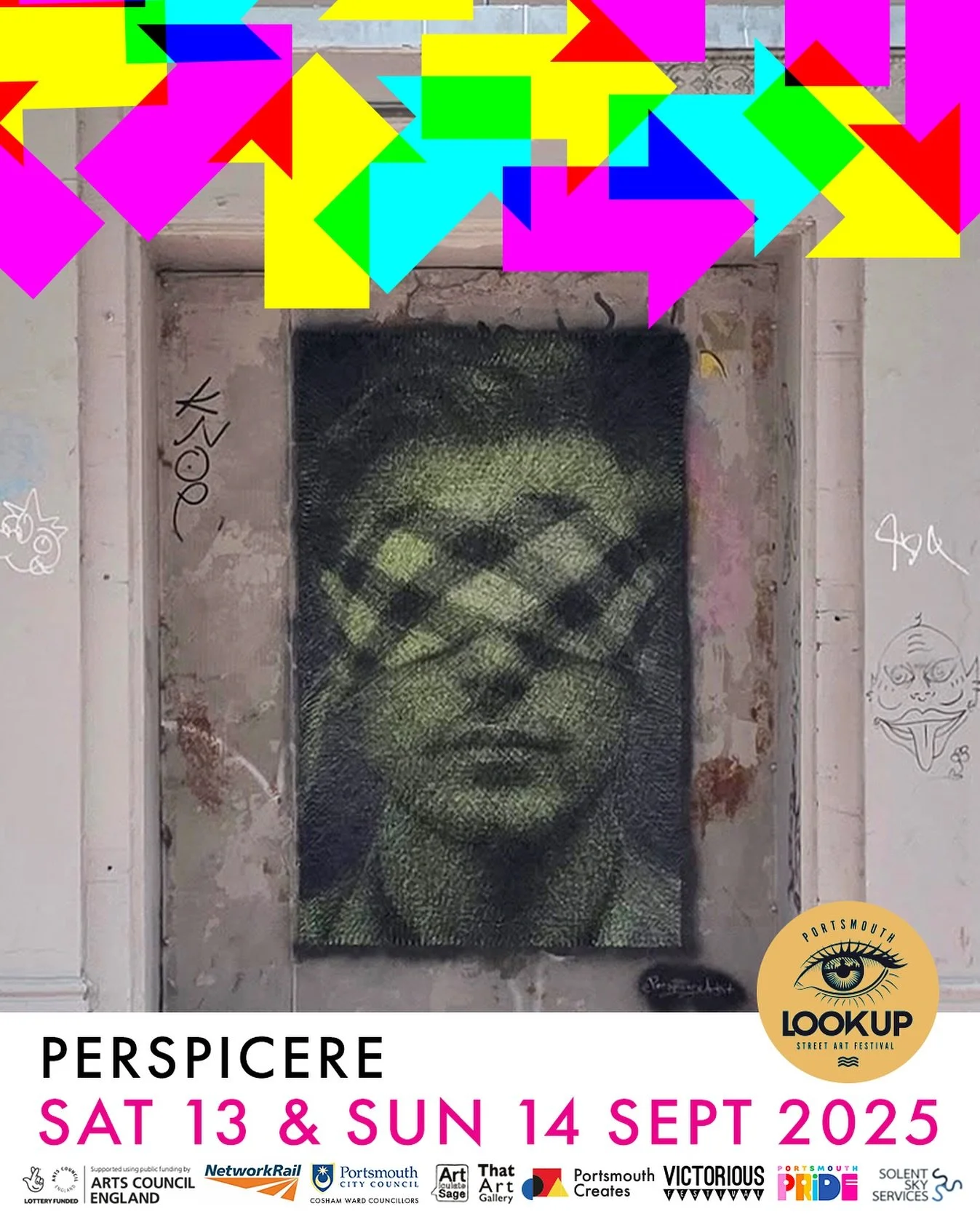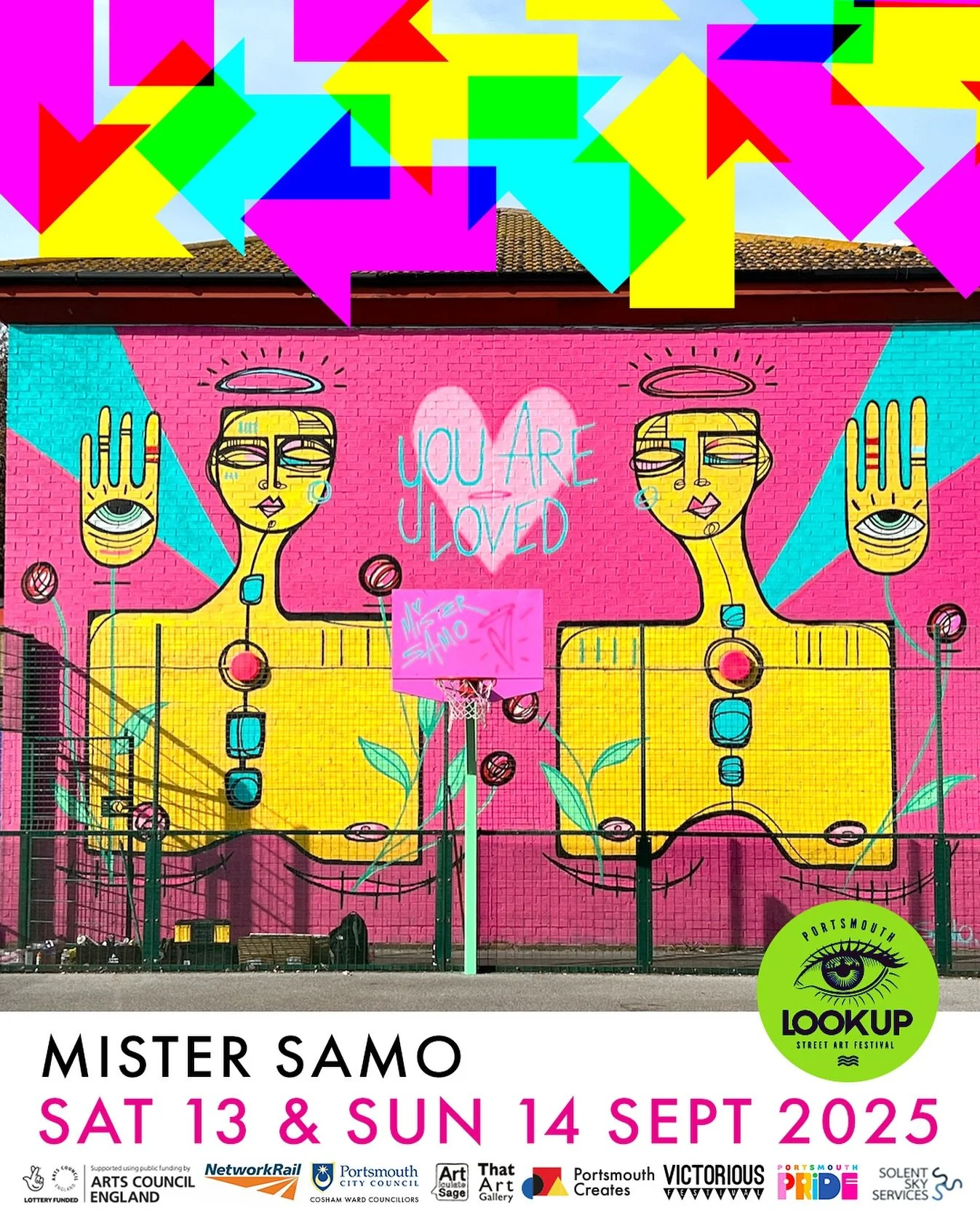 Logos of various art and community organizations supported by public funding, including Arts Council England, Articulates Sage, That Art, Pompey Banana Club, The Grateful Arts Club, Strong Island Clothing Co., Charlotte Cornerlius Jewelry, Alfresco Corner Collective, Selco Builders Warehouse, Lottery Funded, Women in Art, Baffled, Neon Numbers, The Base Guildhall, Ark Charter Academy, Brewers Decorator Centres.